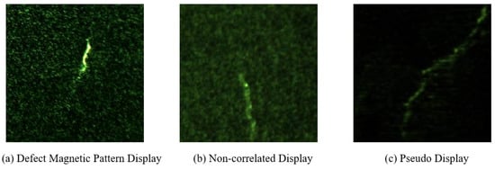 The generation of magnetic traces involves various factors, including the leakage magnetic field at the defect, the leakage magnetic field in non-defective areas, and even the natural deposition and retention of magnetic particles on the workpiece surface [13]. Generally, magnetic traces formed by the leakage magnetic field generated by defects are referred to as defect magnetic trace displays, also known as correlated displays. Correspondingly, magnetic traces formed by the attraction of magnetic particles due to larger leakage magnetic fields caused by changes in the workpiece’s cross-section and material property differences are referred to as non-correlated displays. Magnetic traces not formed by the leakage magnetic field on the workpiece surface are referred to as pseudo displays. The magnetic particle information used in this paper is shown in the following Table 2.