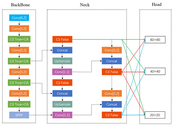 The bearing images captured by industrial cameras have the characteristics of large size and numerous small defects. The pixel size of small defects is relatively small in the entire bearing image. Therefore, the feature information of these small defects is prone to being lost in multiple convolution and pooling operations. This can lead to the network inadequately learning the feature information of small defects and can result in the phenomenon of missed detection. Therefore, in the C3 module of the backbone network, this paper integrates the coordinate attention (CA) mechanism [17] to enhance the focus on the feature information of small defects, thereby improving the detection accuracy of small defects.