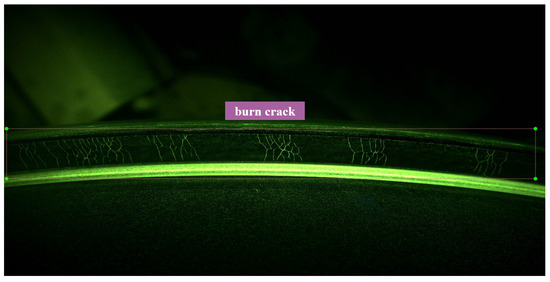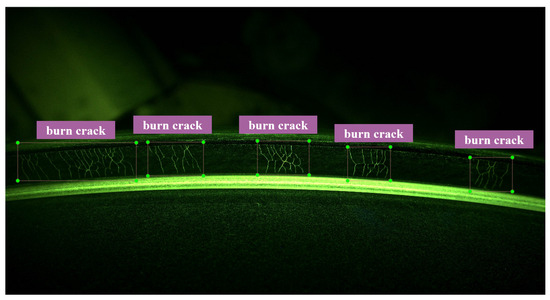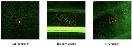 The data used in this study were collected from a bearing manufacturer in China, comprising a total of 1602 bearing images with a resolution of 4096 × 2160. According to the morphology and origin of bearing surface defects, defects were categorized into three classes, denoted as a–c in Figure 16: inclusions, burn cracks, and scratches.