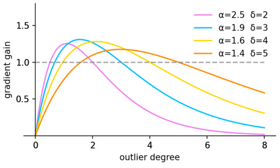The mapping of outlier degree β and gradient gain r, which is controlled by the hyper-parameters α, δ.