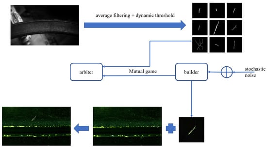 To address these issues, this paper proposes a bearing image data augmentation method based on dynamic thresholds and generative adversarial networks (GANs) [24]. This approach leverages a small number of existing defect images for data augmentation, creating generated samples that closely resemble the original defect samples. This enhances the diversity of the original training data, addressing the problem of limited dataset size. The schematic diagram of this data augmentation method is shown in Figure 13.