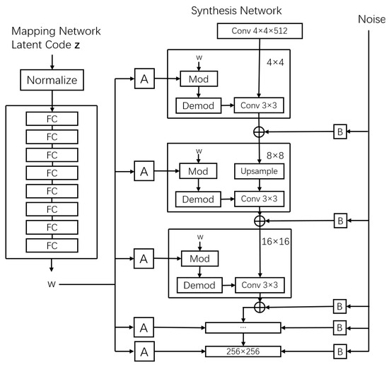As one of the state-of-the-art high-resolution image generation methods, StyleGAN has its shortcomings, including slow network-training speed and the presence of noticeable speckled artifacts in generated feature images. To address these issues, NVIDIA released StyleGAN2 [26]. Experimental findings revealed that the adaptive instance normalization operation in the StyleGAN network structure causes feature images to contain speckled artifacts. StyleGAN2 redesigns the network architecture based on StyleGAN. Firstly, it decomposes the adaptive instance normalization operation into normalization and modulation steps. Secondly, it moves redundant biases and noise broadcast operations between different resolution layers. Finally, it uses demodulation instead of normalization. These adjustments in StyleGAN2 have been proven to effectively reduce the occurrence of speckled artifacts and accelerate network-training speed. The StyleGAN2 network structure is depicted in Figure 15.