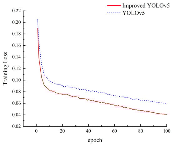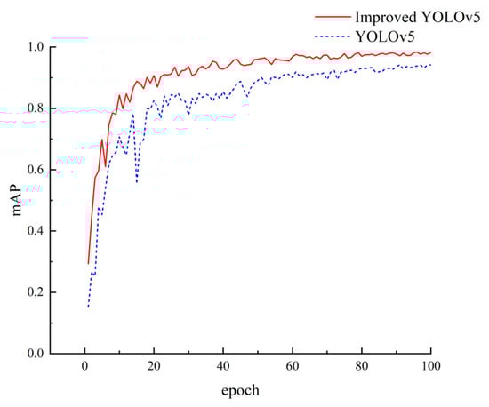 The improved YOLOv5 model was compared with the baseline model in terms of mAP curve and training loss curve, as shown in Figure 17 and Figure 18, respectively. Figure 17 illustrates the comparison of training loss curves, while Figure 18 presents the mAP curve comparison. It can be observed from Figure 17 and Figure 18 that, in comparison to the baseline model, the improved model exhibited lower training loss values and higher detection accuracy.