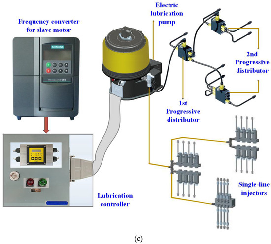 - A CLS schematic diagram was designed (Figure 1c), which was parallel to the auxiliary motor and driven by the same frequency converter. The output voltage of the frequency converter was 220V-690VAC. The CLS used a complete set of oil supply devices, which could supply oil to multiple lubrication points [29]. It was divided into progressive lubrication systems and single-line lubrication systems. A progressive system generally consists of four basic components: an electric lubrication pump, progressive distributors, pipeline components, and a control system. The single-line lubrication system can be regarded as a safety redundant structure of the progressive lubrication system. The amount of dynamic fuel supply was directly proportional to the voltage of the frequency converter, which also caused dynamic changes in the dynamic friction coefficient.