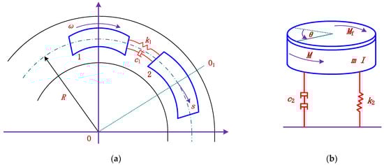 We used the simplified physical model developed by Zhao et al. [24] to explain the physical essence of the LSJ phenomenon in the yaw system, as shown in Figure 2a, and assumed that the part connecting the yaw lead motor and the load was the active driving first unit, and the shaking part of the load was the passively driven second unit. Note that the auxiliary motor associated with the CLS system is precisely embedded in the driven second unit (see Figure 1b). In Figure 2a, the active part (1) pushes the driven part (2) at rotational speed ω. k1 is the stiffness coefficient; c1 is the viscous torsional damping coefficient between friction surfaces and transmission parts. Due to the existence of rotational speed ω, with the push of the active part, 1, the spring repeats the processes of energy storage and energy release, and the driven part, 2, repeats the processes of acceleration and deceleration, thus forming a circular “sticky-sliding” jumping motion, forming a low-speed shaking microvibration, which is the mechanism of the LSJ. Figure 2b is the vibration model of the yaw system.