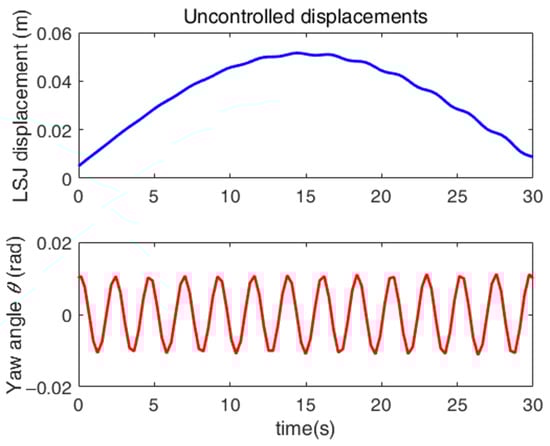 Figure 3 shows the simulation results of the uncontrolled LSJ displacement and yaw angle under the condition of the external driving torque . It can be seen that, although the yaw displacement seems relatively stable, in reality, it is in a slow and gradual state of divergence. The LSJ displacement presents a large fluctuation peak within 30 s, with the maximum value reaching 0.05 m, that is, the peak value 0.05 m causes the physical fatigue and structural failure of the yaw system in the long-term fluctuation process. Therefore, the vibration control of the LSJ displacement is absolutely necessary, provided that the yaw displacement is controlled and converges.