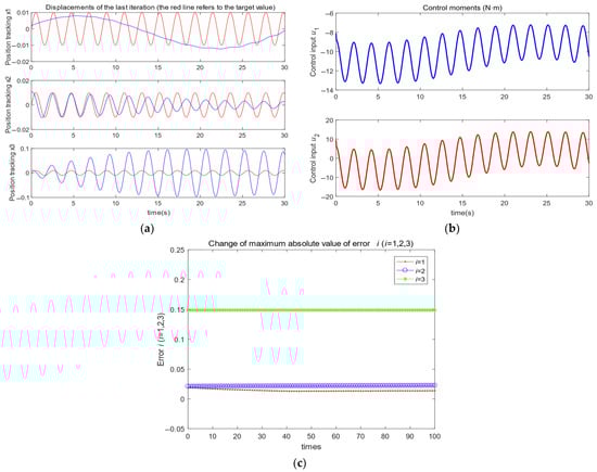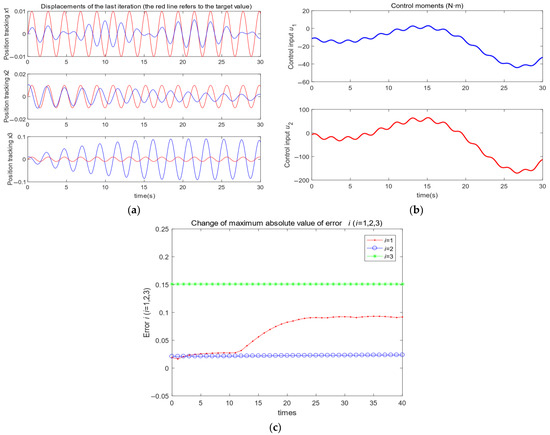 Illustrations: (a) results of the three displacements in the last iteration process; (b) control input signals (); (c) changes in maximum absolute values of errors with iterative times.
