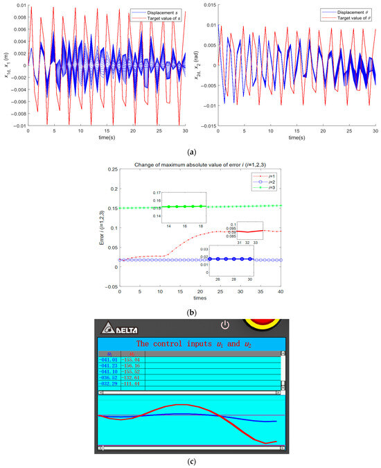 Illustrations created by using odeN Solver. (a) The controlled two displacements: LSJ displacement and yaw angle ; (b) changes in the maximum absolute values of errors with iterative times; (c) practical control inputs displayed by HMI by using odeN Solver.