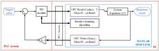 - Due to the limited memory of the PLC, many complex intelligent control algorithms cannot be directly run, which can lead to hardware memory overflow errors or a loss of control effectiveness due to long software scanning cycles. And, the iterative algorithm in this article is one of such complex algorithms, so we adopted a refined HITL technique [30]. The main program of the iterative algorithm will still run in the MATLAB environment, while only the algorithms related to the PD controller will be run in PLC hardware. On the one hand, this solves the problem of hardware memory overflow errors and avoids the disadvantage of long software scanning cycles. On the other hand, due to the built-in PD control unit and complex hardware interface communication functions of the PLC, it enhances the real-time adaptability of the PLC hardware. As iterative algorithms themselves are complex algorithms, other similar complex intelligent control algorithms can also apply this refined HITL technology to achieve optimized control functions. Of course, for various conventional optimization algorithms and technologies, such as optimal trajectory control technology [38], the entire intelligent control algorithm can be directly implemented in the PLC through programming, fully reflecting the real-time adaptability of PLC hardware.