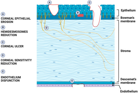 Chronic exposure to hyperglycemia triggers pathophysiological changes in cells, tissues, and organ systems, due to the promotion of oxidative stress, the activation of polyol pathway and protein kinase C (PKC), the formation of advanced glycation end-products (AGEs), and alteration of gene expressions [22]. The cornea is an avascular structure containing no blood vessels, receiving glucose via trans-corneal transport from the aqueous humor. Glucose is also present in tears, but its levels are lower than in the aqueous humor and serum [23]. Given that the cornea receives glucose from the aqueous and not the adjacent tear film, it is not surprising that in patients with diabetes, the cornea is exposed to high levels of oxidative stress and inflammation representing distinct features of diabetes in all other tissues [24,25]. Corneal complications range from mild to severe manifestations and comprise epithelial defects, corneal thickness, erosions, and corneal nerve abnormalities [26] (Figure 1).