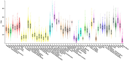 Tissue distribution of ADNP. Boxplot of transcripts per million (TPM) showing the bulk tissue gene expression for PACAP. The Genotype-tissue Expression (GTEx) on 10 January 2024.