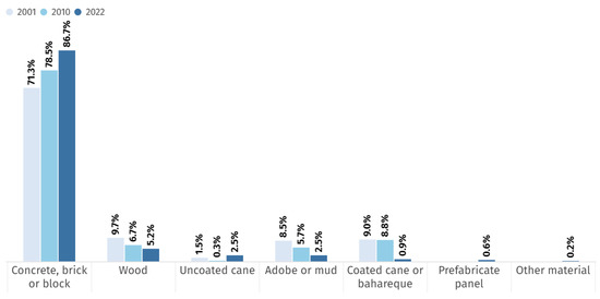 According to the 2022 census conducted in Ecuador, more than 86% of the exterior walls of homes are constructed with concrete, brick, or blocks, whereas only 8.5% of homes have adobe or mud walls [15]. Figure 1 shows the percentages obtained over the past two decades.