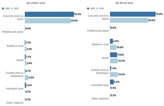 Percentage of houses according to the predominant exterior wall material [15], (a) urban area; (b) rural area.