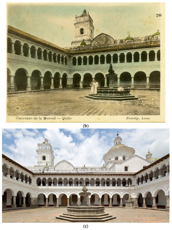 Convent of La Merced Quito over the years. (a) The proposed Inca structure, hypothesized to be the foundation upon which a Catholic convent was subsequently erected [19]; (b) Convent of La Merced—Quito, 1910–1920 (Photography by Instituto Nacional de Patrimonio Cultural); and (c) Convent of La Merced—Quito [20].