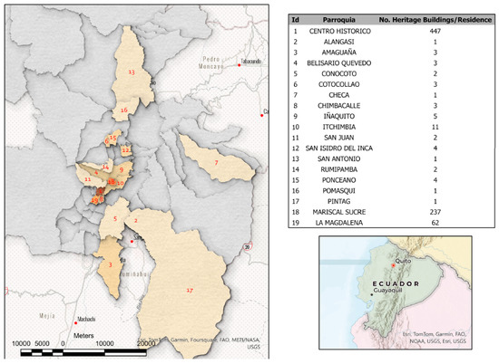 Despite the passage of time, laws such as the Organic Cultural Law have ensured preservation and maintenance of adobe structures. The Instituto Nacional de Patrimonio Cultural maintains an inventory of more than 23,000 heritage structures, each incorporating various construction techniques [22]. Quito, declared a World Heritage Site by UNESCO on 8 September 1978, is the city with the highest historical value in the country. Figure 4 shows the number of heritage buildings classified as residential, commercial, or educational buildings.