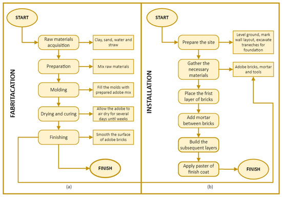 Process flow of adobe (a) manufacturing and (b) installation (graphs by authors).