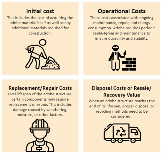 Korentz et al. [42] affirmed that the building construction process could be divided into three distinct stages: investment, service, and demolition. By conducting Life Cycle Cost Analysis (LCCA), it is possible to evaluate the costs associated with each period. The literature and local adobe makers provided the input and output data for this investigation.