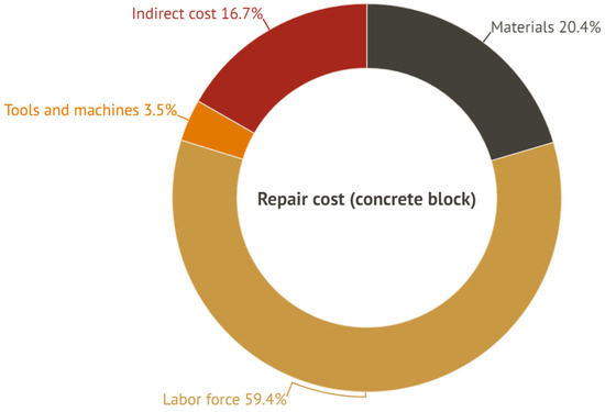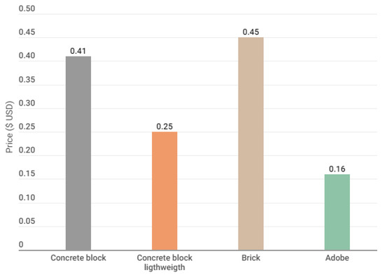 Furthermore, it is worth noting that in South America, conventional masonry constructions predominantly employ adobe and concrete bricks measuring 10 × 20 × 40 cm [5]. This allowed for a detailed cost comparison between the utilization of adobe and concrete bricks.