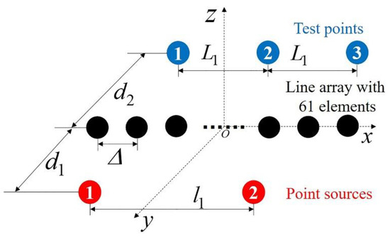 This subsection explains the process and error of the noise separation technique using the phase conjugation method by separating noise pressure caused by the first and second point sources from the total noise pressure generated by two sources at three test points. Figure 2 is the schematic diagram of the point source simulation: the distance of two sources is , which is greater than half of the maximum wavelength of the transformer noise sound wave to ensure the accuracy of phase conjugation and to better meet the requirements of the substation noise analysis environment. The distance of the test points is , and and () are, respectively, array-to-sources and array-to-test-points distances. The line array is composed of 61 microphone elements, the element spacing is , and the array aperture is , which is the best combination of array aperture and elements spacing that minimizes the separation error shown in the figures of page 7. The model shown in Figure 2 simulates acoustic field generated by two point sources in air whose density is and sound velocity is . The first and second point source intensities are and , initial phases are both 0, and frequencies are (step length is 1 Hz). The theoretical solution of the sound field generated by a point source in the air is .
