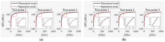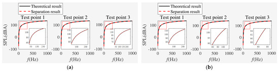 Firstly, we obtain the amplitude and phase of sound pressure and its gradient at the line microphone array according to theoretical solution of a point source in air (simulating the measurement process of the microphone array in an acoustic field), and we reconstruct the source intensity ratio and phase value of the point source using the phase conjugation method. Secondly, the sound pressure amplitudes of three test points are obtained by the theoretical solution of a point source in air, and the sound pressure amplitudes of the first, second, and third test points are obtained by the equivalent point source method. Finally, the theoretical A-weighting SPL (sound pressure level) of point sources 1 and 2 at three test points are compared with those obtained by the separation technique, and the comparison results are shown in Figure 3. It can be seen that the values of the theoretical equation and the separation technique are basically consistent at the analyzed frequencies but still have errors. In order to analyze the reasons for the errors, Figure 4 illustrates the results comparing the A-weighting SPL between the separation technique and the theoretical solution when the source intensity ratio and phase value are taken as the set values (). It can be seen that the A-weighting SPL of the separation technique and theoretical solution are completely consistent, which means that errors between the separation technique and theoretical solution originate from reconstruction errors of point source information using phase conjugation.