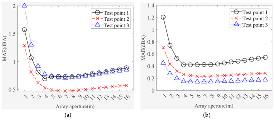 As can be seen from Figure 5, the MAE first decreases and then increases with the array aperture increases for all point sources and test points, the MAE increases rapidly when the array aperture is smaller than the source distances, and the smallest error appears where the array aperture is 6 m (i.e., 1.5 times the source distances).