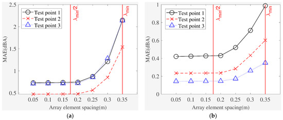 As can be seen from Figure 6, the MAE increases, with the array element spacing increasing for all point sources and test points, and the MAE increases rapidly when the element spacing is greater than half-wavelength at a minimum analyzed frequency of .