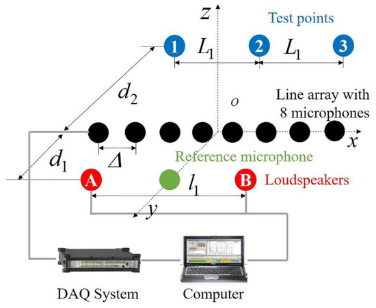 In order to verify the accuracy of the noise separation technique using the phase conjugation method, it is necessary to conduct a validation experiment using sound sources that have known source information and can emit sound independently. In order to simulate the field situation of a substation, we carried out noise separation of two same-type loudspeakers in a semi-anechoic room environment. Table 1 lists the experimental equipment. All the equipment is connected according to the schematic diagram shown in Figure 7, where the source distance is ; the distance of test points is ; and are, respectively, array-to-sources and array-to-test-points distances; the line array is composed of eight microphone elements and the array element spacing is ; and a reference microphone is located in middle position of two loudspeakers.