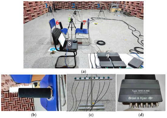 Experimental scene in semi-anechoic chamber: (a) experimental equipment setup, (b) loudspeaker, (c) line array, (d) DAQ system.