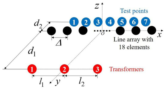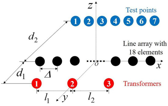 On the basis of point source simulation and experimental validation, we carried out a noise separation test for three transformers in a substation. The three transformers have the same model, with dimensions approximately 5 m × 5 m × 2.5 m, voltage of 110 kV, and power rating of 50,000 kVA. The reasonableness of the separation results is proved by analyzing the noise line spectrum and A-weighting SPL obtained from the separation sound pressure results of three transformers at different test points. The test is divided into two test conditions according to the horizontal distance between the microphone line array and transformers. The schematic diagrams of Condition 1 and Condition 2 are given, respectively, in Figure 9 and Figure 10, where is the distance between the microphone line array and three transformers (2 m in Condition 1, 10 m in Condition 2); is the distance between the microphone line array and test points (8 m in Condition 1, 0 m in Condition 2); the x-coordinates of the seven test points are the same as those of No. 3, 5, 7, 10, 12, 14, and 17 microphones in the line array; is the array element spacing; and and are the distances between the three transformers, which are 15.25 m and 15.72 m, respectively.