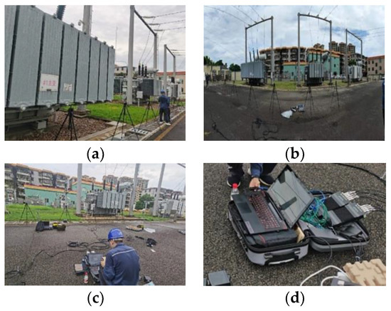 Test scene in substation: (a) line array setup for Condition 1, (b) line array setup for Condition 2, (c) connection between line array and DAQ system, (d) connection between DAQ system and computer.