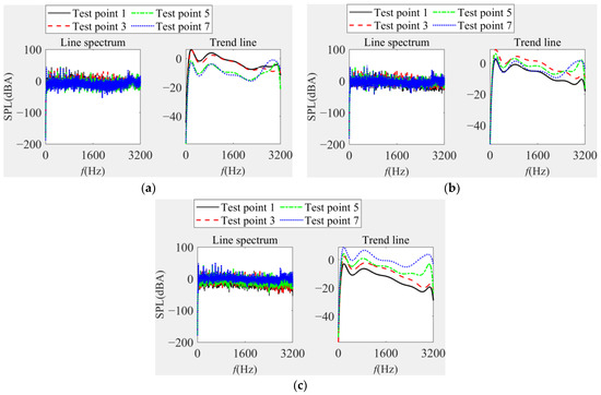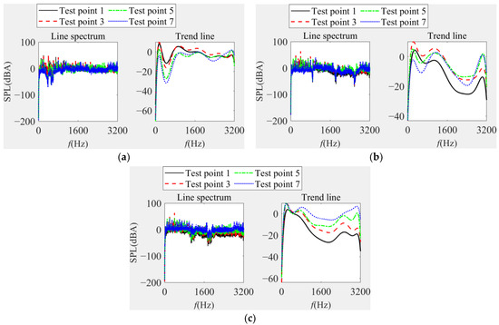 The SPL line spectrums and their trend lines from 0 to 3200 Hz for test points 1, 3, 5, and 7 for three transformers in Conditions 1 and 2 are shown in Figure 12 and Figure 13. We choose test point numbers 1, 3, 5, and 7 to show, in Figure 12 and Figure 13, without limiting generality for the sake of clarity of the line spectrum. It can be seen from Figure 12 that the A-weighting SPL line spectrums and the trend lines of the four test points are intertwined, which means the Condition 1 results do not satisfy the law that noise pressure data have to decrease as the distance between test point and source increases, and vice versa. Figure 13 illustrates that the locations of A-weighting SPL line spectrums and their trend lines are highest at test point 1 but lowest at test point 7 for transformer 1, the locations of line spectrums and trend lines are higher at test points 3 and 5 but lower at test points 1 and 7 for transformer 2, and the locations of line spectrums and trend lines are highest at test point 7 but lowest at test point 1 for transformer 3, which means the Condition 2 results satisfy the law that noise pressure data have to decrease as the distance between test point and source increases, and vice versa.