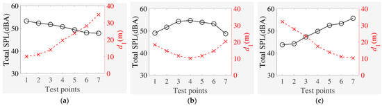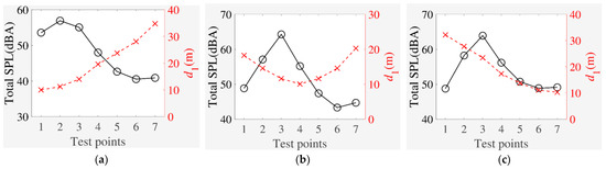 Total A-weighting SPL and the test-point-to-source distance of 7 test points (Condition 2): (a) transformer 1, (b) transformer 2, (c) transformer 3.