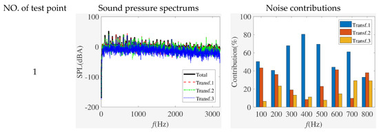After the noise separation test, we are able to obtain sound pressure spectrums and contributions of each transformer in the substation, which can be used to guide the vibration and noise reduction for the substation. The final noise separation results of three transformers at all seven test points (the total sound pressure spectrums, the separated sound pressure spectrums, and the noise contributions of each transformer in Condition 2) are shown in Figure A1. Figure 16 only illustrates the final noise separation results at test point 1 as an example. Considering the final results, it is possible to quantitatively give the effect magnitude of the three transformers on the noise at any test point among their working frequencies. For example, if the location of test point 1 is a residential building, we should carry out vibration and noise reduction measures to make noise at this location reach a set standard, and then only transformer 1 needs to be designed for vibration and noise reduction because of its maximum noise contribution to test point 1, as illustrated in Figure 16.