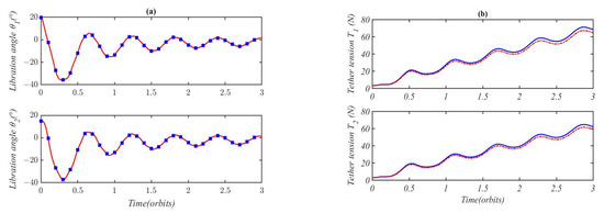 Figure 4a shows the numerical results of the libration angles in the present study and in [22] when the deploying velocity of tethers is 1 m/s. The libration angles calculated in this study (indicated by squares) are in good agreement with those in [22], as depicted in Figure 4a. Figure 4b shows the tether tension in the present study (dotted line) and [22] (solid line). The numerical results indicate that the tether tension in [22] was slightly higher compared to the present study. From Equations (10) and (13), the tether tension comprises Coriolis, in-plane roll, and gravitational acceleration, which are the same as the results in [22]. In this simulation, the Coriolis and in-plane roll acceleration in [22] and this study are the same. So, the difference arises from the variation in gravitational force truncation during the approximation process. In this study, only the first-order terms were retained when expanding the gravitational force using the Taylor series. It can be concluded that an accurate dynamic model of gravity helps in accurately estimating tether tension.