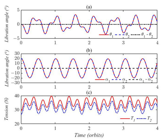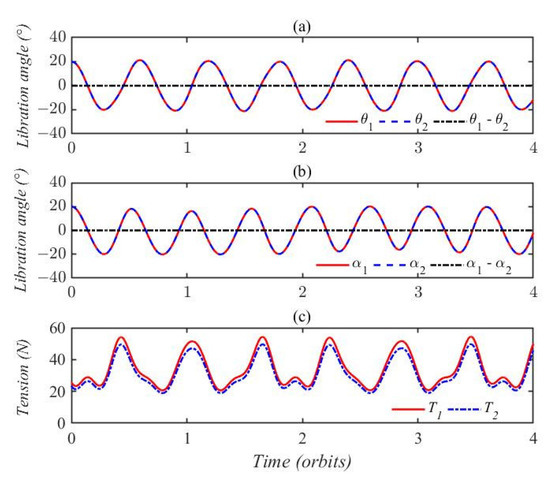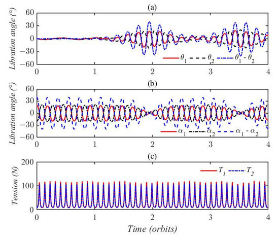 In case 2, the initial attitude angles were set as , indicating that the initial in-plane and out-of-plane angles were equal and the two tethers were collinear. Figure 6a shows the dynamic response of in-plane libration angles and , and it can be seen that the two curves oscillate periodically and overlap. The out-of-plane pitch motions are illustrated in Figure 6b, where it can be seen that the motions of pitch angles and are identical. The tension in this case is depicted in Figure 6c, where it can be seen that tension T1 is larger than tension T2 and the two curves exhibit quasiperiodic variation. The amplitude of tension in Figure 6c is almost equal to the maximum value of tension in Figure 5c, despite the addition of out-of-plane pitch motion.