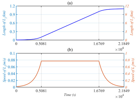 Predesigned motion of two tethers. (a) Deployed tether length. (b) Deployed velocity.