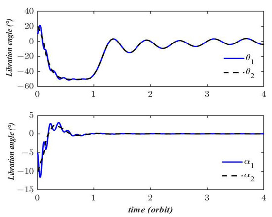In order to verify the validity of the dynamic equations obtained in this study, their dynamic characteristics in this study and those in [22] were tested under the same conditions. In [22], the out-of-plane motion is ignored in the model, thus the out-of-plane motion should be neglected in Equations (9)–(14). Substituting the out-of-plane libration angles into Equations (9)–(14), we have four degrees of freedom, and the corresponding generalized coordinates are and . Therefore, the same physical model is achieved. The equations of motion were verified by comparing the dynamic responses calculated in this study with the model responses reported by Shi et al. [22] with the same initial conditions and physical parameters. To facilitate the comparison, the initial conditions and relevant physical parameters of the system were set uniformly. The initial conditions were set as , , , and , which were randomly selected within reasonable limits. In order to reflect the movement of the tether, the tether velocity was set to . The physical parameters of the system were the same as those in [22]: orbit radius set at , mass of main satellite , mass of subsatellites set at , . The simulations were solved in a circular orbit in MATLAB 2017b with ODE45, an RK4 numerical integrator with variable step size.