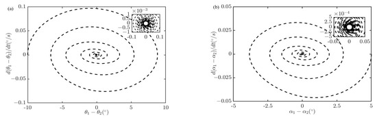 To investigate the effect of this deployment strategy, we performed a simulation with the predesigned motion. It should be noted that the specified deployment rate is assumed to be driven solely by tension, and the tension can be obtained with Equations (9) and (12). The system parameters are chosen as , , , and , which are from [22]. The initial attitude variables are , , , and , which are selected randomly. In order to ensure that the initial attitude is static, the initial angular velocities of attitude are set as . Figure 11 displays the time histories of the libration motions obtained with the deployment strategy. It shows that the predesigned deployment strategy effectively eliminates the out-of-plane libration motion after almost one orbit, while the in-plane libration motion exhibits a purely sinusoidal variation that persists even after the completion of deployment. To further analyze the libration motion, the phase diagrams of θ1 − θ2 and α1 − α2 are presented in Figure 12. The phase diagrams reveal that the differences in in-plane θ1 and θ2, as well as α1 and α2, tend to be very small limit cycles. Combined with the results of Figure 11 and Figure 12, it can be concluded that the deployment strategy can effectively and stably complete the task, the libration motion in the whole process is no more than 90°, and instability will not occur after deployment.