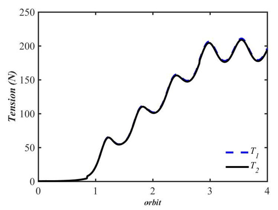 Figure 13 presents the time history of the tension in two tethers. It can be observed that the tension in both tethers increases over the first three orbital periods and subsequently fluctuates periodically around constant values, exhibiting a very small amplitude. Therefore, it can be inferred that the libration angles attain a stable state once the deployment is complete. An important aspect that deserves attention is that the tension values in both tethers remain non-negative integers throughout the entire process, indicating the absence of slackness. In summary, the simulation results demonstrate that the predesigned deployment strategy is suitable for suppressing libration during the development of the TB-TSS and ensures that both in-plane and out-of-plane motions maintain stable limit cycles. Furthermore, although the speed of the two tethers is different, the oscillation characteristics and dynamic performance of their tension remain virtually identical.