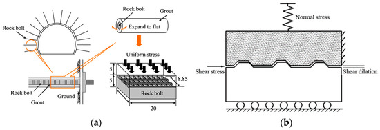 The specimen of the Bolt-Grout interface consisted of a steel part and a grout part. Referring to Zhang et al. [15,35,36], the simplified 2D surface profile of the steel plate was used to simulate the bolt rod. The concept and process to make a flat specimen of the grout-rock interface is shown in Figure 2. The lateral boundary conditions of the unfolded surface have been simplified by the bolt’s real force to create a two-dimensional shear model, as seen in Figure 2b.