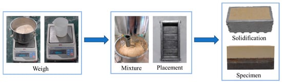 In the preparation of the gypsum specimens, the steel mold was placed in a mold the size of L × W × H = 200 mm × 100 mm × 100 mm. The mold was brushed with mineral oil; then gypsum and water were mixed according to the mass ratio of 2:1, and stirred well with a mixer; the stirred gypsum slurry was poured into the mold and put on the shocking table for 1 min to exclude the air bubbles. Finally, the excess gypsum slurry was scraped with a scraper to keep the surface of the specimen flat. The plaster reached a certain strength after 30 min of resting, the mold was removed, and the specimen was taken out and cured in the air environment for 7 d to get the molt-grout specimen. Specific process is shown in Figure 4. The physico-mechanical parameters of gypsum are shown in Table 1.