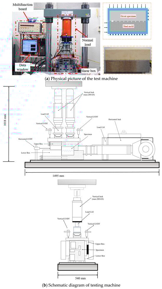 Bolt-Grout interfaces were tested in shear using a CNC-type shear test set-up [37,38], which is shown in Figure 5. The apparatus consisted of a loading system, data acquisition and a controlling system. Throughout the test, the top shear box could move in a normal direction but not the shear direction, while the lower box could only move in the shear direction. Controlling the servo-controlled hydraulic pump and the hydraulic cylinders applied the maximum of both the normal and shear forces at 200 kN. Two LVDTs were positioned parallel to the lower shear box’s surface to measure the displacement brought on by the shear forces, and four LVDTs were positioned on top of the shear box to measure the normal displacement. The precision of the LVDTs was 0.001 mm, with a range of 0–20 mm.