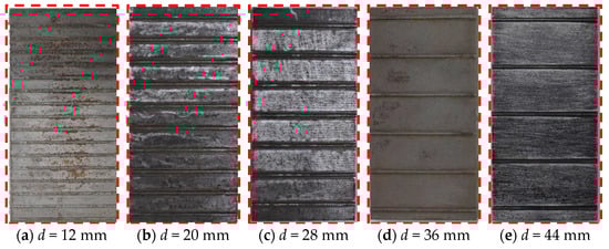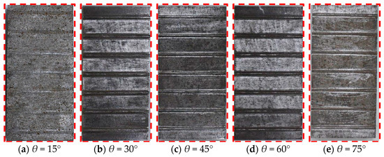 For ease of exploring the impact of varying rib angles on interface failure modes, we conducted a specific analysis on the failure morphology of the interface under normal stress σn = 2 MPa for five different rib spacings, as illustrated in Figure 17.