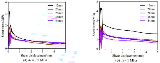 Figure 10 illustrates the variation of peak strength with rib spacing under different normal stresses. The change rule of peak strength is the same, i.e, the increase in rib spacing shows the change trend of decreasing and then increasing. Meanwhile, the smaller the rib spacing, the more obvious the change. For example, when the normal stress was 0.5 MPa, the shear strength decreased by 1.33 MPa and 0.15 MPa when the rib spacing was increased from 12 mm to 20 mm and 28 mm to 36 mm, respectively. The figure also shows that, under all typical stress conditions, the shear strength at 44 mm rib spacing surpasses 36 mm, which is due to the change in the failure mode.