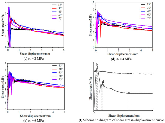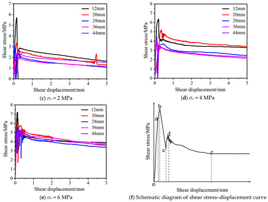 The shear stress-shear displacement curves of interfaces for five rib spacings under various normal stresses are displayed in Figure 8a–e. From these figures, the curves for each of the five groups, with varying rib spacings, clearly show a typical trend of peak-shaped curves. These curves can be classified into six stages, as shown in Figure 8f.