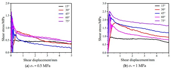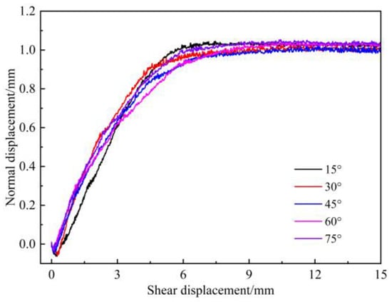 The normal displacement-shear displacement curves under different rib angle conditions have roughly the same morphology, and the normal displacements show a tendency to decrease and then increase and then level off, as shown in Figure 12. In the early stage of shear, the difference in normal displacement under different rib angle conditions is small, which is because the change in normal displacement at this stage is caused by the compression density and elastic deformation, and the internal cleavage and elastic modulus of each specimen are the same again. As the shear displacement increases, the discrepancy in the normal displacement among various rib angles becomes more pronounced, the normal displacement was the largest at 15° and the smallest at 30°, and with the increase in rib angle, the normal displacement showed a tendency of decreasing first and then increasing. This is because shear expansion and slippage failure mainly occur at 15°, and there is no shear fracture failure, and the normal displacement is larger, and the phenomenon of raised shear-break failure occurs at 30°, and the normal displacement is smaller.