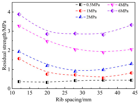 Figure 11 illustrates the variation of residual strength with rib spacing under different normal stresses. As the rib spacing rises, the residual shear strength generally exhibits a trend of dropping and then increasing. It is significant to observe that, at 0.5 MPa, the residual shear strengths for all five rib spacings are comparable. The rib spacing has a minimal effect on the residual shear strength. This is because the residual shear stress is mainly generated by the friction of the interface. The interface friction is weaker at 0.5 MPa, and changing the rib spacing no longer affects the interface friction.