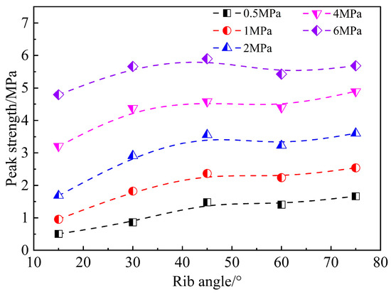 Figure 12 illustrates the variation of peak strength with rib angles under different normal stresses. The pattern of variation is the same for all five normal stress conditions, as the peak strength exhibits a trend of initially increasing, followed by a decrease, and then subsequently increases with the increase in rib angle. There is a continuous increase in the peak strength from 15° to 45° of the rib angle. However, the growth rate begins to decrease, indicating a diminishing return on increasing the rib angle. Subsequently, when the rib angle is more than 45° to 60°, the peak shear strength begins to decrease. Finally, the peak shear strength begins to recover again as the rib angle continues to increase. The reason is that shear-slip failure mainly occurs when the rib angle is small, with the increase in the rib angle, the protruding part of the gypsum specimen starts to shear-break failure, and the peak shear strength increases; meanwhile, the increasing angle will make the protruding part of the gypsum specimen more easily sheared, and the peak strength decreases; the promotion of shear is no longer evident when the angle reaches a particular magnitude, but the interfacial meshing effect is more significant, and the peak strength goes back up. There exists a relative optimum value for the rib angle, and the greatest value of peak strength can be considered to occur when the rib angle is 45°.