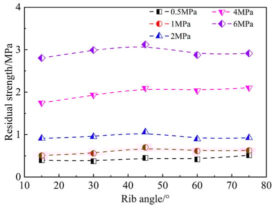 Figure 13 illustrates the variation of residual strength with rib angles under different normal stresses. Compared with the peak strength, the residual strength is less affected by the rib angle, but the rule of change is similar, with the increase in the rib angle, the residual shear strength exhibits a trend of initially increasing, followed by a decrease, and then subsequent increase, when the rib angle of 45°, it can be considered that the residual shear stress appeared to be the maximum value. The reason for this phenomenon is that shear-slip failure occurs when the rib angle is small, and as the rib angle increases, shear-break failure begins to occur; shear-slip produces smaller debris, which is manifested as smaller residual shear stress and shear break-break failure make the bulge failure more serious, and the interface is rougher, with a larger residual shear stress. The effects of normal stresses on peak and residual shear strength for different rib angle conditions are the same as for different rib spacing conditions.