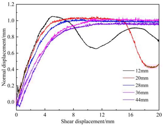 Since the normal displacement curves exhibited a similar trend for specimen under different normal stress conditions, we take the normal stress of 2 MPa as an example to illustrate the shear dilation behavior of Bolt-Grout interface. Figure 14 and Figure 15 illustrate the normal displacement-shear displacement curves for different rib spacings and rib angles under a normal stress of 2 MPa. When the rib spacing is small, such as 12 mm and 20 mm, the normal displacement decreases because the gap at the Bolt-Grout interface is compacted in the early phases; afterward, the normal displacement progressively rises due to the shear dilation; finally, due to the existence of the “climbing effect”, the normal displacement exhibits a cyclical pattern of initial decrease followed by a subsequent increase. For larger rib spacing, such as 28 mm, 36 mm and 44 mm conditions, the trend of normal displacement is approximately the same, and all show a tendency to decrease and then increase before leveling off. The rib spacings have different effects on the normal displacement in the final stage of shear, which is mainly due to the increase in rib spacings, the number of ribs in the interface decreases, so that the “climbing effect” is no longer obvious, and the number of cyclic changes in normal displacement decreases.